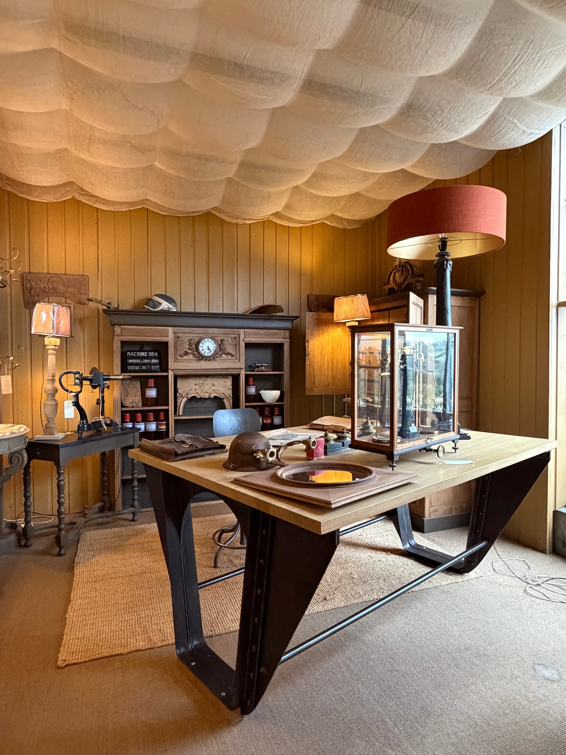 Bureau création : composé d'un plateau en chêne massif et d'un piétement en acier industriel.