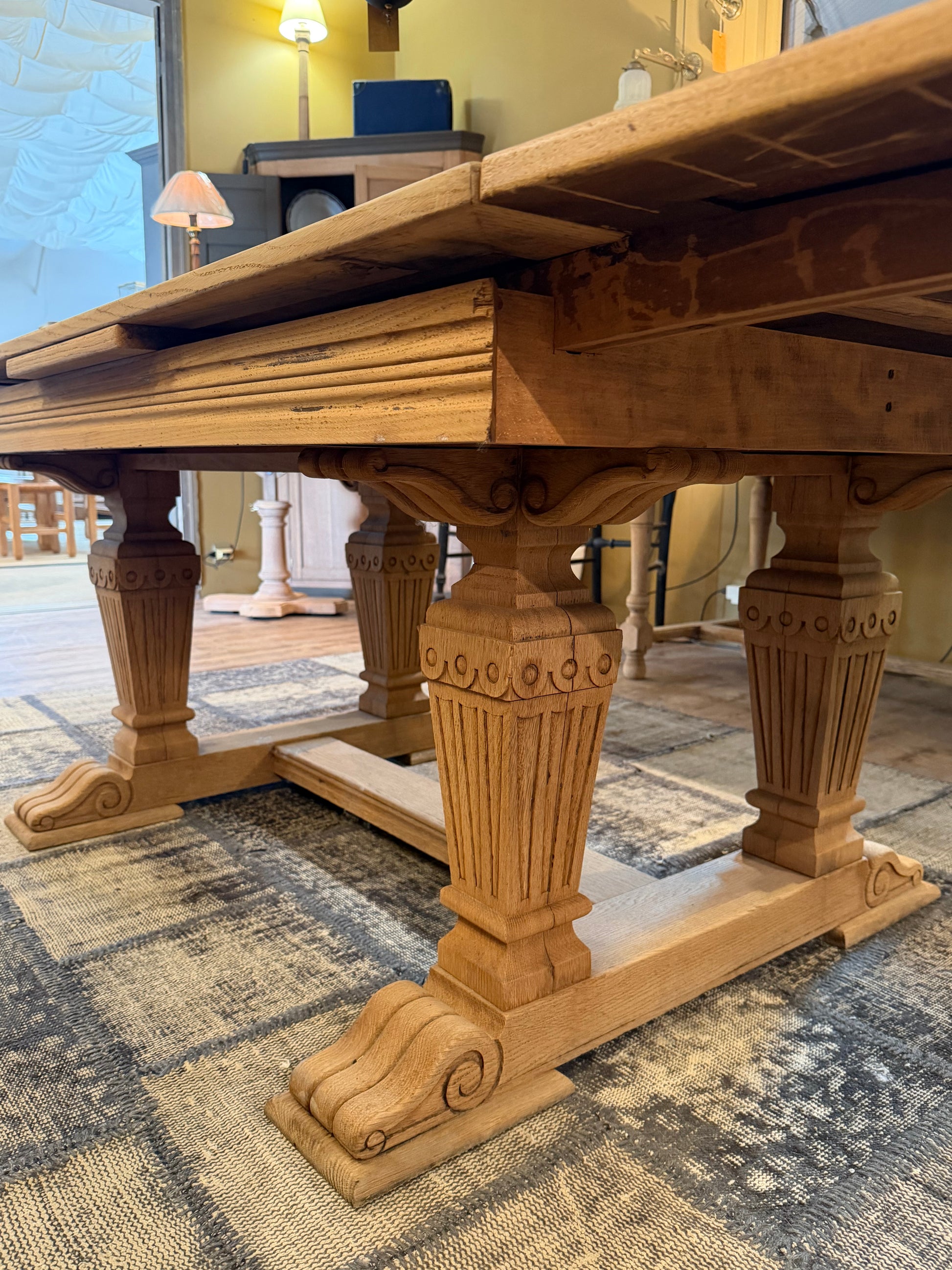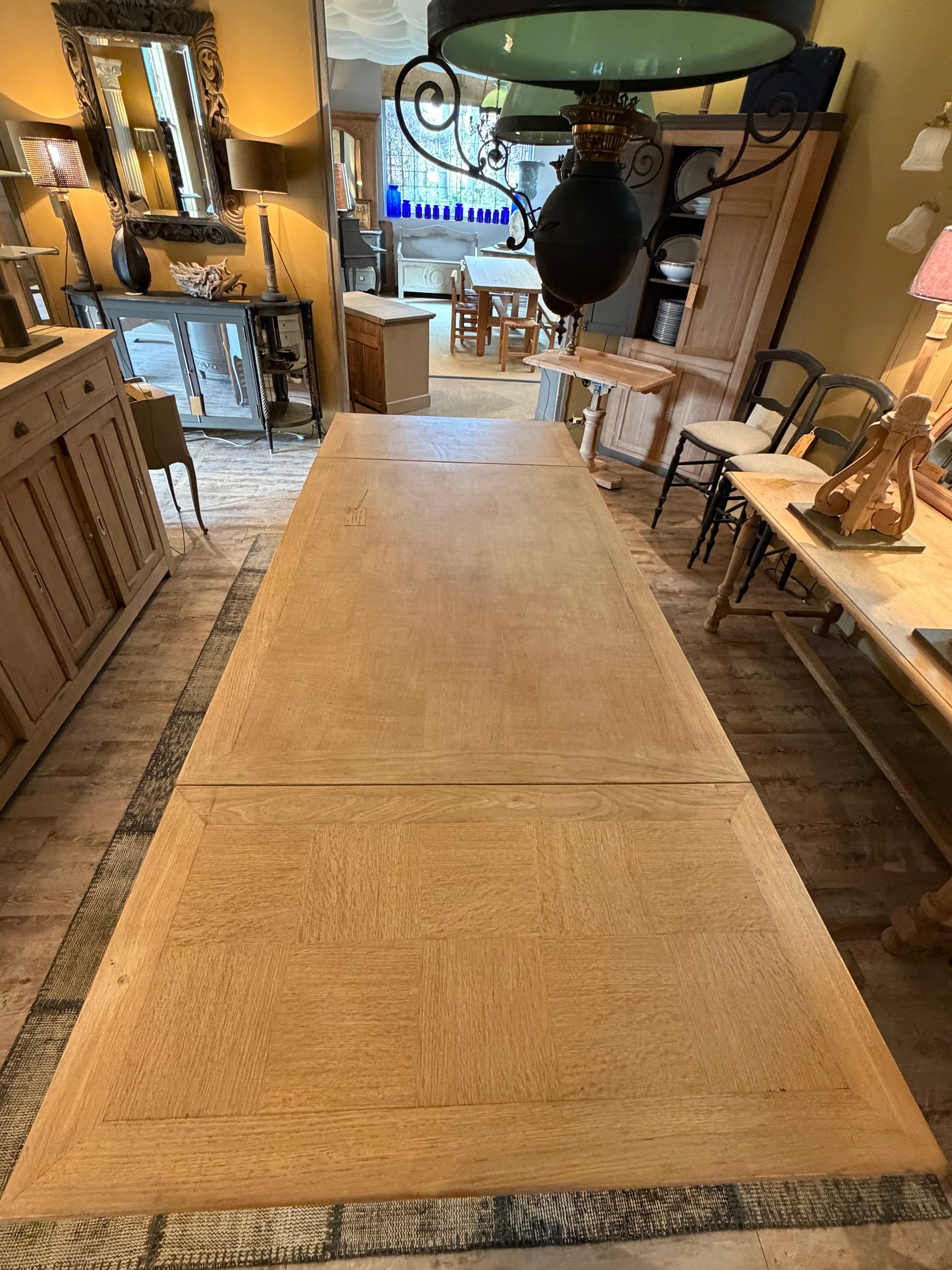Table en chêne massif : Longueur 1,50 m, avec deux allonges de 0,54 m (longueur totale ouverte 2,58 m)